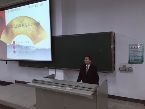 1月12日,法学院2014-2015学年冬季小学期环境法专题课程在5号教学楼214教室正式开始。中国政法大学民商经济法学院环境资源法研究所所长王灿发教授就《中国环境法的现状和未来展望》为题,为法学院2012级本科生带来了精彩的讲授。 王教授主要从我国环境法的发展进程、我国环境法面临的挑战和问题以及未来发展的展望几个方面深入浅出地为大家进行了分析与讲解,他将理论与实践相结合,剖析深刻,举例生动。王教授还适时引导同学们进行探讨研究,带动了同学们的学习积极性,整个课堂气氛活跃,同学们受益匪浅。