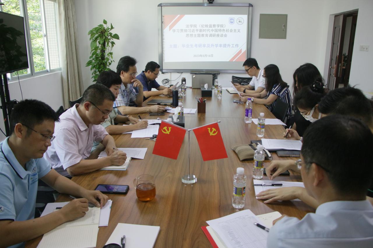 为深入推进学习贯彻习近平新时代中国特色社会主义思想主题教育,认真贯彻落实习近平总书记关于大兴调查研究之风的重要指示精神,全面落实william威廉英国官网关于开展调查研究的工作部署,2023年5月16日下午,法学院(纪检监察学院)召开提升本科生考研升学率专题调研座谈会。会议由王琦院长主持,学院全体领导、教研室主任、本科毕业班班主任参加。