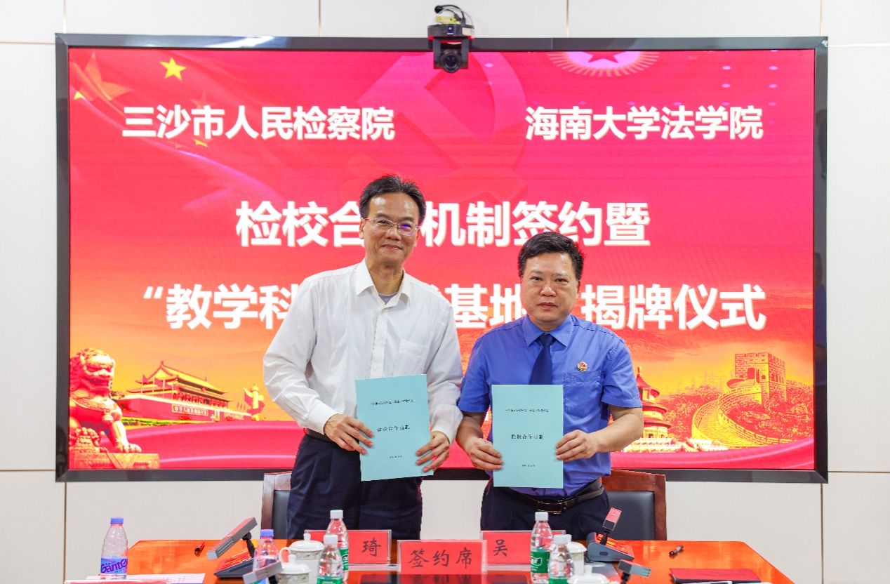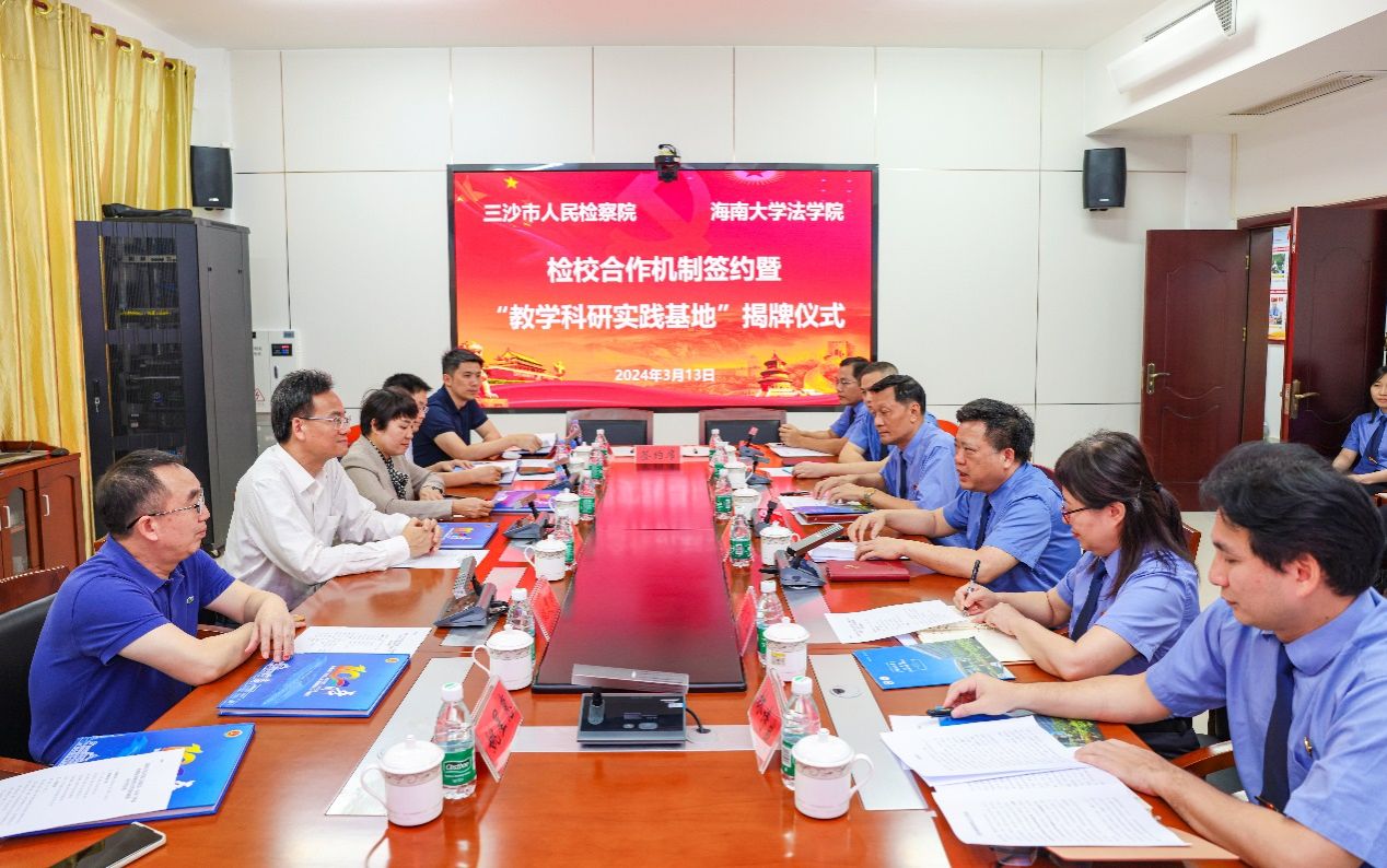 为进一步践行习近平法治思想,深入学习贯彻党的二十大精神,携手撬动法学教育、法学研究与检察实务的多赢杠杆,共同探索检校共建合作机制,2024年3月13日,我院与海南省三沙市人民检察院在三沙市永兴岛举行了检校合作签约暨教学科研实践基地挂牌仪式。