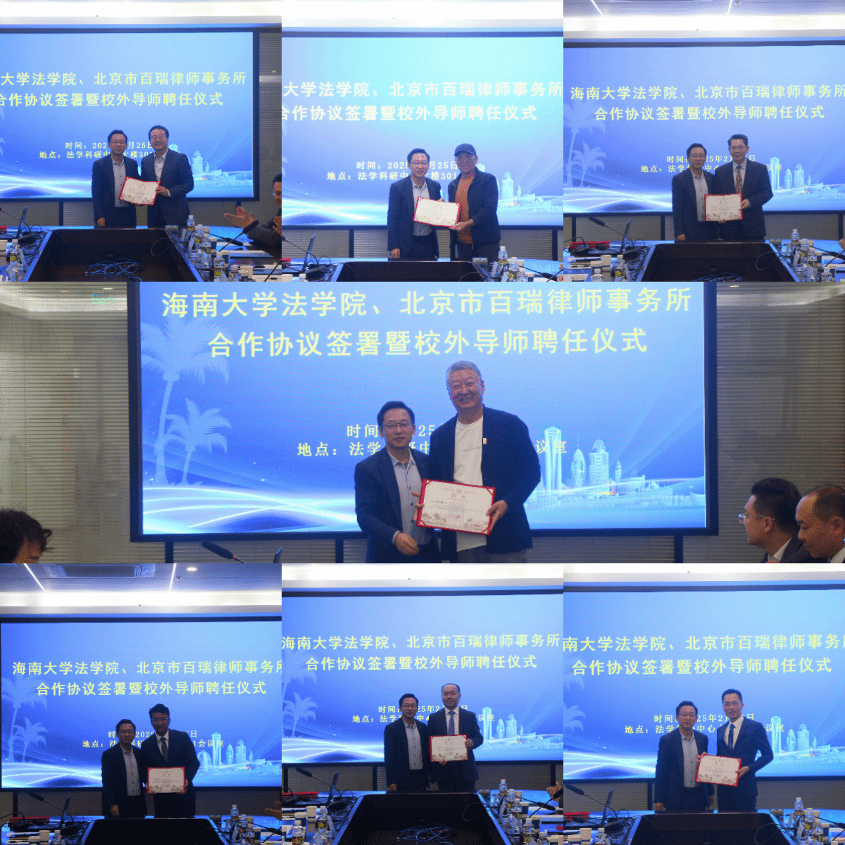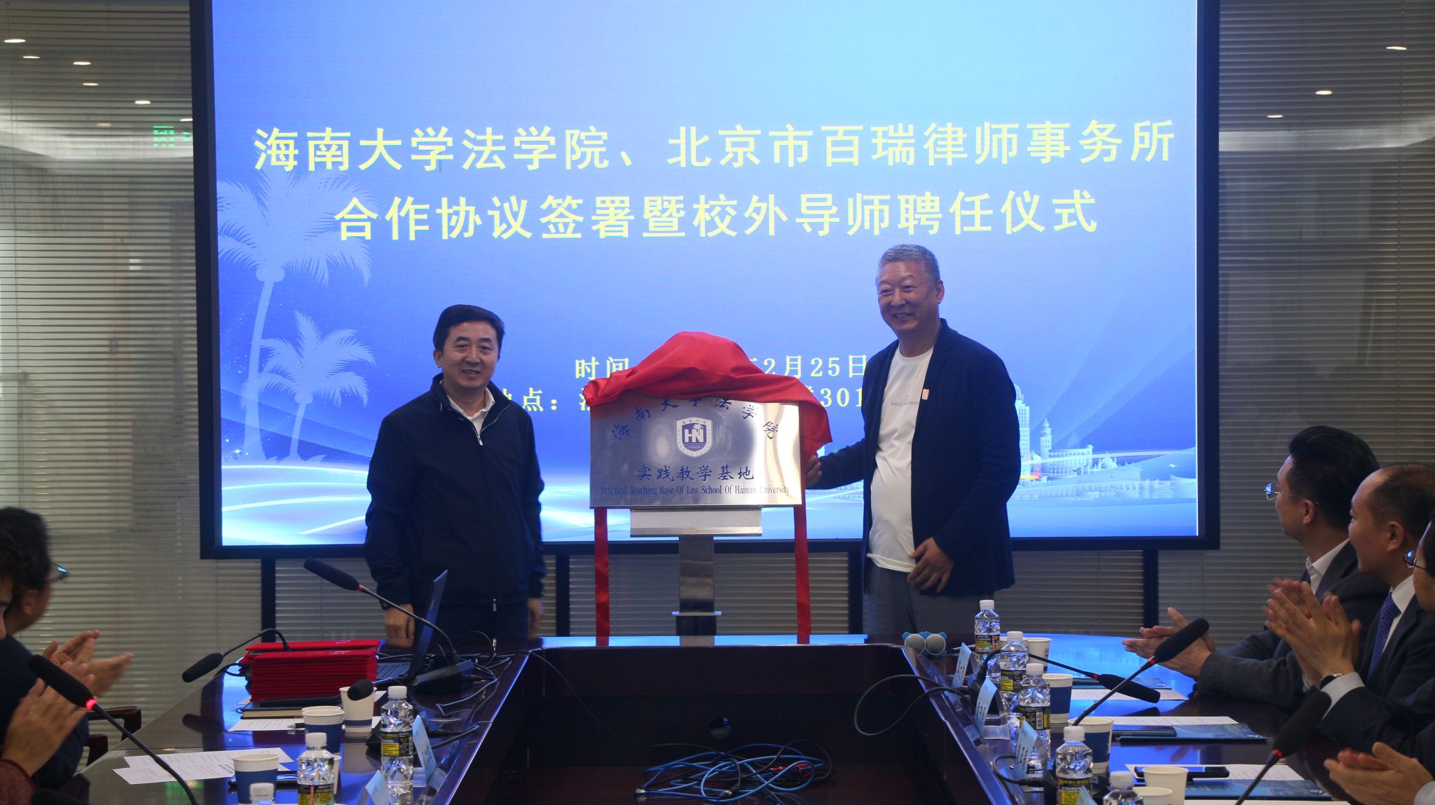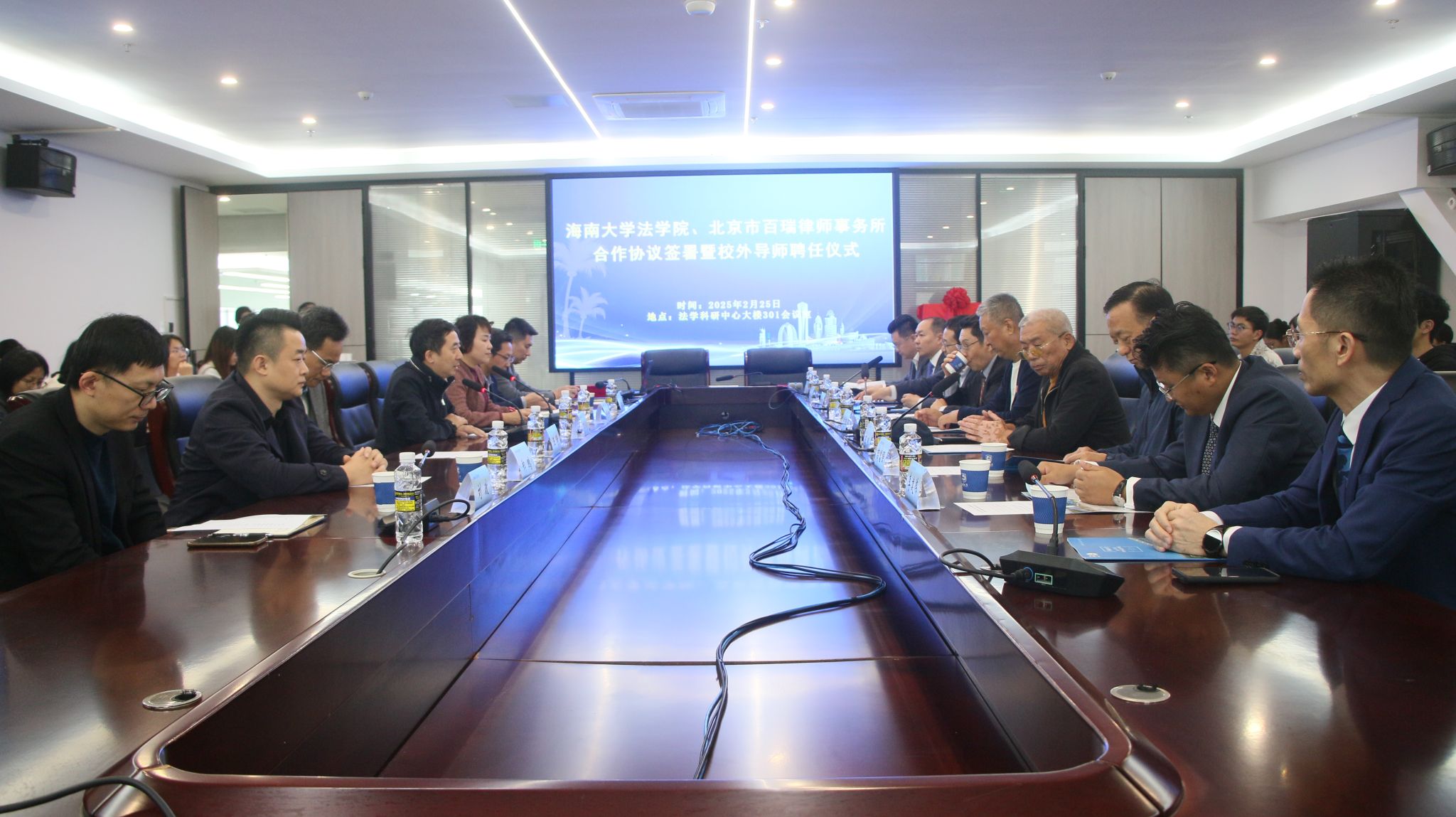 2月25日下午,我院与北京市百瑞律师事务所合作协议签署暨校外导师聘任仪式在法学科研中心大楼301会议室举行。北京市百瑞律师事务所主任王志强,原国务院法制办政府法制协调司司长青锋,原国家禁毒委员会办公室专职副主任(正局级)王刚,原海南省司法厅副厅长、一级巡视员高富强,北京市百瑞律师事务所高级合伙人赵亚春一行十人受邀参与活动。william威廉英国官网党委常委、副校长聂清斌,法学院党委书记蒙秋妍、院长王琦,椰风书院党委书记郑鹏,法学院师生代表近40人参与会议。会议由学院党委书记蒙秋妍主持。
