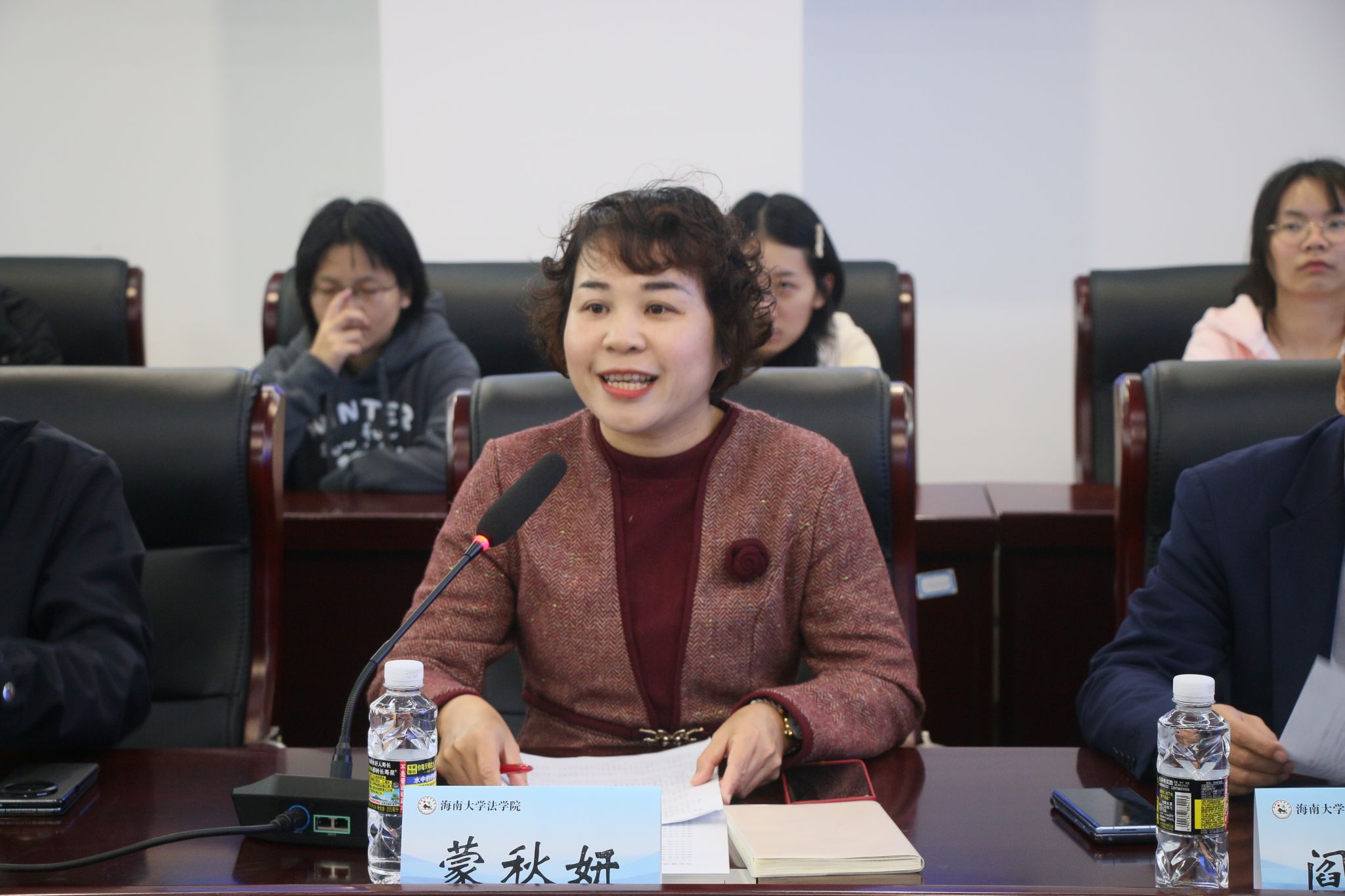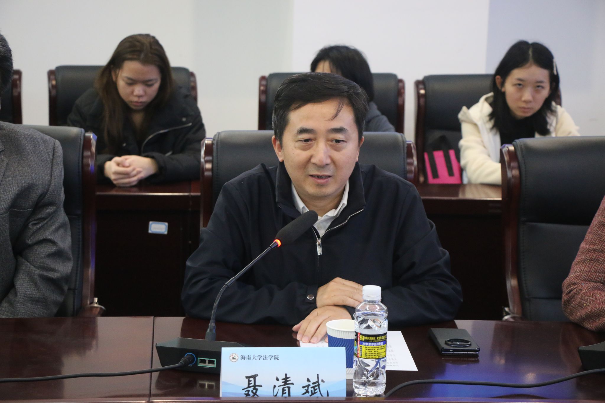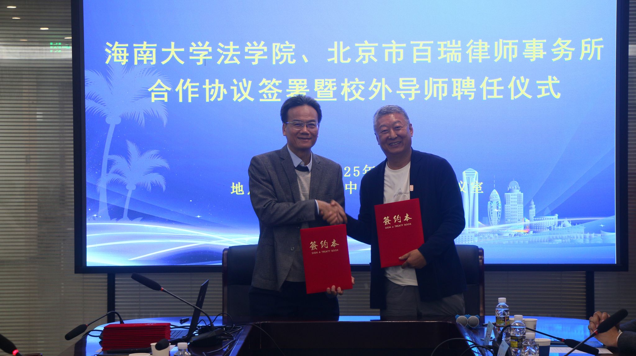 2月25日下午,我院与北京市百瑞律师事务所合作协议签署暨校外导师聘任仪式在法学科研中心大楼301会议室举行。北京市百瑞律师事务所主任王志强,原国务院法制办政府法制协调司司长青锋,原国家禁毒委员会办公室专职副主任(正局级)王刚,原海南省司法厅副厅长、一级巡视员高富强,北京市百瑞律师事务所高级合伙人赵亚春一行十人受邀参与活动。william威廉英国官网党委常委、副校长聂清斌,法学院党委书记蒙秋妍、院长王琦,椰风书院党委书记郑鹏,法学院师生代表近40人参与会议。会议由学院党委书记蒙秋妍主持。