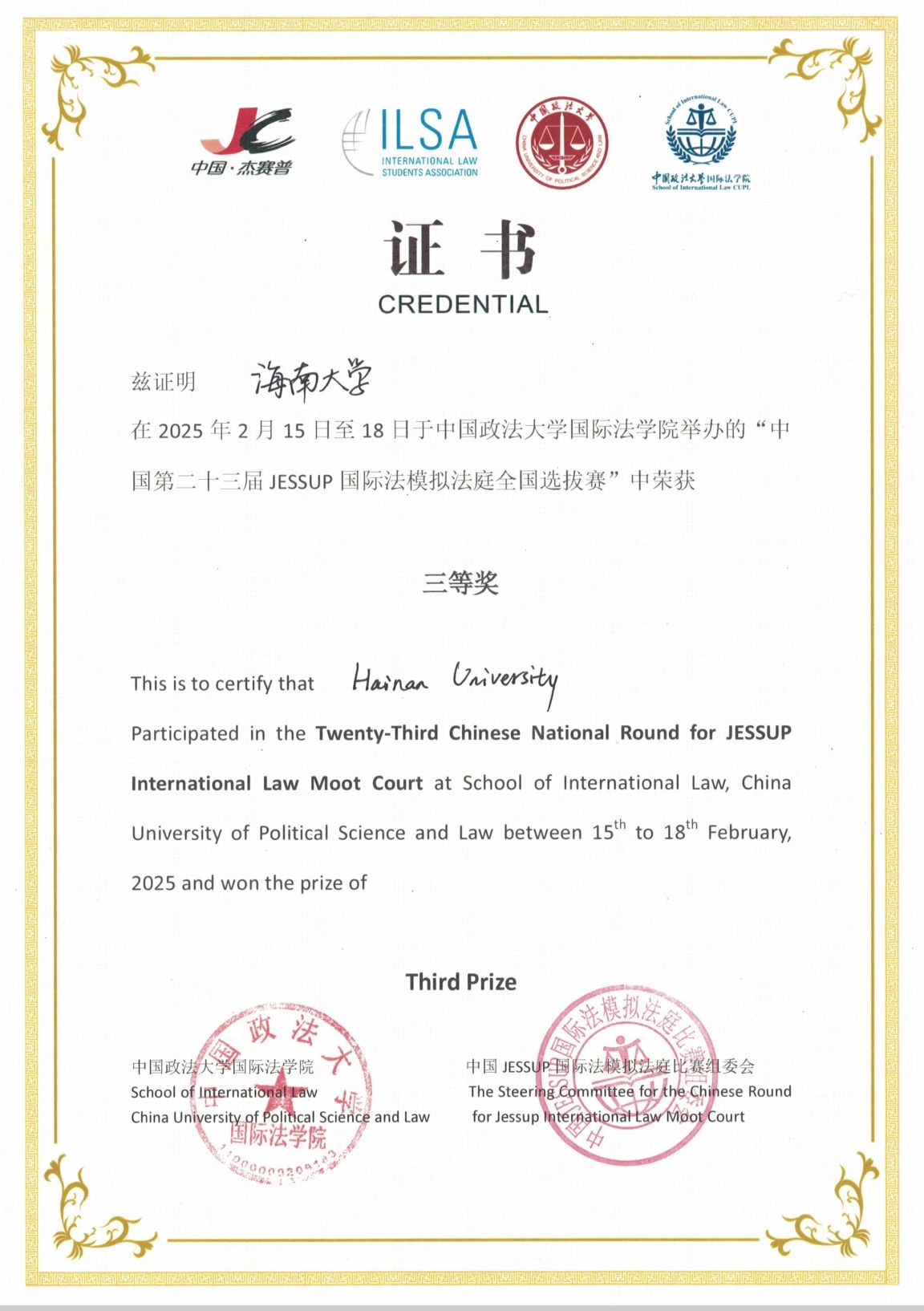 2025年2月15日至18日,第六十六届“杰赛普”国际法模拟法庭竞赛(Philip C. Jessup International Law Moot Court Competition)暨中国第二十三届“杰赛普”全国选拔赛在北京市中国政法大学举行。本次比赛共有66支队伍参赛,经过激烈交锋,我校代表队最终荣获全国三等奖。