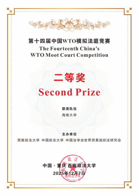 2025年12月7日下午,第十四届中国WTO模拟法庭竞赛决赛在西南政法大学(渝北校区)圆满落幕。经过多轮激烈角逐,我院代表队凭借扎实的专业素养和出色的赛场表现,最终荣获全国二等奖,并分获被诉方书状一等奖、申诉方书状二等奖。