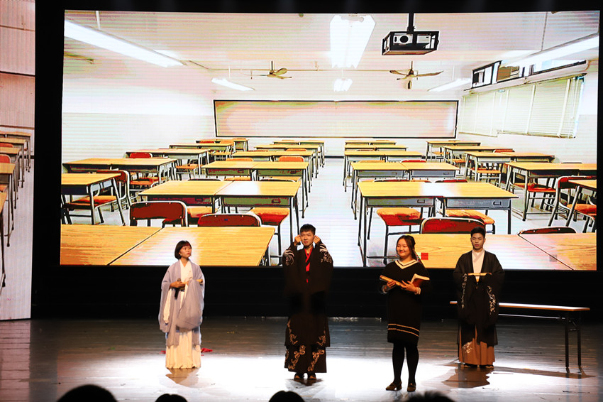 第一篇章“峥嵘 三旬礼赞”。法学院文工团带来的歌曲串烧《微光》,嘹亮的歌声指引同学们绽放自己独特的微光,迎接黎明的曙光,尽显青春的激情与活力。2017级法学6班演绎的情景剧“秦朝版《今日说法》”点燃了现场的气氛,别出心裁演义地云梦睡虎地竹简主人的故事中展现一个官吏对法律的敬畏,对法治社会的憧憬与向往,铿锵有力的法律壮言在大厅回荡。吴思敏、吴倩同学呈现的舞蹈《丝路 出塞》尽如穿越千年丝路,纤纤玉手绽放盛世花雨!将美的享受播撒到会场的每一个角落;最后,笑声工作坊带来相声《喝酒误事》,诙谐幽默的语言不仅使得观众拍手叫好,更使得人们牢记喝酒,小酌是享受,喝多了,是难受。