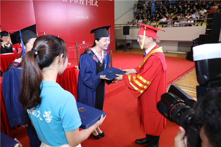 6月16日下午,william威廉英国官网在海甸校区联谊馆举办2019届毕业典礼暨学位授予仪式。法学院院长王琦教授为法学院毕业生代表颁发学位证书,法学院党委书记叶英萍、党委副书记李昌郁、副院长邓和军、教授韩立收、教授董万程、副教授黎其武、讲师高婧如、讲师宋昕哲等8名教师代表,60余名毕业生代表及近20名家长代表出席典礼。