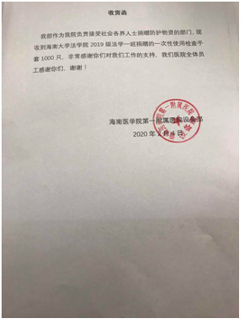 在收到同学们的捐赠物资后,受赠医院向1班发来接收函和感谢信,向同学们表示感谢。愿我们的这一点点心意,能为前方奋战的医务人员带去一点点支援。