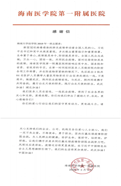 在此法学院号召,希望各班级向2019级法学1班学习,发扬“一方有难、八方支援”的中华民族优良传统,发扬 “奉献、友爱、互助、进步”志愿精神,积极行动,积极献爱心,为抗击疫情奏响法律人的青春乐章!