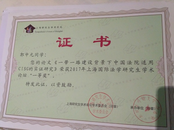 我院国际法学研究生郭中元所撰写的《“一带一路”建设背景下中国的法院适用CISG的实证研究》一文,荣获本次论坛一等奖。并获邀做专题发言。