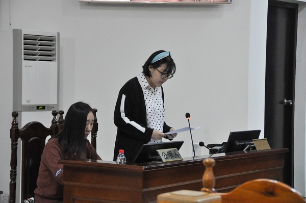 之后,同学们来到了审判区参观,在庄严地审判庭内,同学们仔细观看了审判台、法袍和法槌,认真倾听了法官关于审判庭和审判人员角色分工的讲解。在法官的指导下开展了“模拟审判”。 “模拟审判”严格按照刑事审判的程序进行,主要包括庭前准备、开庭审理、法庭调查、法庭辩论、被告人最后陈述。模拟审判结束后,秀英区人民法院刑庭冯兰茜法官对此次模拟审判进行了详细的点评。