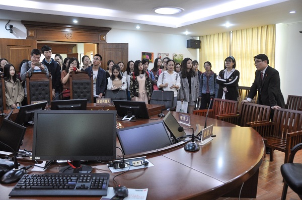首先,在秀英法院朱少江副院长的带领下同学们参观了一楼立案大厅作为诉讼服务中心的职能。 少年法庭的陈斌庭长为同学们一一介绍少年法庭的审判区、羁押区和会见区。其中特别介绍最具有特色的审判区,审判区有别于普通民刑审判庭,为“圆桌审判”,而非控辩双方“对峙审判”。被告人、法定代理人、公诉人、审判长等人围坐一桌,主要是为了营造和谐的庭审氛围,消除未成年被告人的恐惧和抵触心理,促使其顺利接受量刑和教育改造。