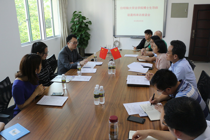 4月3日下午,在学术报告会后,我院与伯明翰大学法学院博士生导师诸晨炜在C-202小会议室举行座谈会。叶英萍书记、王琦院长、李昌郁副书记、邓和军副院长、民法教研室主任董万程教授、魏德才副教授、校国际合作交流处外事科科长林仕岛、院办主任虞衍聪教、研办秘书金海兰等参加座谈会。座谈会由学院党委书记叶英萍教授主持。