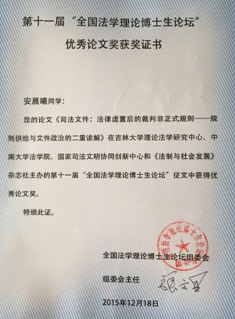 2015年12月19日—20日,由中南大学、吉林大学、国家司法文明协同创新中心以及《法制与社会发展》杂志社共同主办,中南大学法学院承办的第十一届“全国法学理论博士生论坛”在中南大学举行。本届论坛的主题为“全面依法治国背景下中国法治话语体系的建构”。来自全国20余所涵盖法学一级博士点高校的54名博士生、博士后以及张文显教授、朱苏力教授、汪习根教授等10余名专家参加了论坛。我院诉讼法学博士生安晨曦受邀参加了论坛,其提交的作品《司法文件:法律虚置后的裁判非正式规则——规则供给与文件政治的二重读解》荣获本届论坛最高奖项——“优秀论文奖”,并在“司法理论与司法制度”单元中作了主题发言。 本次论坛的举办得到了学界的广泛关注和热烈响应。论坛组共收到全国以及海外各法学院校博士生投稿180余篇。经专家匿名评审,共评出参会论文56篇,其中“优秀论文奖”5篇、“优秀论文提名奖”7篇。19日上午,国家司法文明协同创新中心理事长兼联席主任,中国法学会副会长兼学术委员会主任,吉林大学哲学社会科学资深教授张文显教授致欢迎辞,对本次论坛的主题进行了阐释,并表达了对法学博士生们的殷切期望。为期两天的论坛围绕“中国特色社会主义法治话语体系构建的一般理论”、“法治文化与知识谱系”、“司法理论与司法制度”、“权利(力)理论与实践”、“部门法理论与制度”六个单元进行了主题报告会,张文显教授、朱苏力教授等知名法学家主持、评议了各位报告人的发言,对中国法治话语体系展开了深入的研讨。 会议举办期间,张文显教授、朱苏力教授分别以“中国法治新常态”、“社会分层、利益分歧与立法”为主题作了学术讲座,使全体师生深受启发,激发了与会学生的学术热情。 12月20日上午论坛举行闭幕式。闭幕式由中南大学法学院院长陈云良教授主持,张文显教授致闭幕辞,闭幕式中进行了“优秀论文奖”、“优秀论文提名奖”颁奖以及会旗交接仪式。//www.hainanu.edu.cn