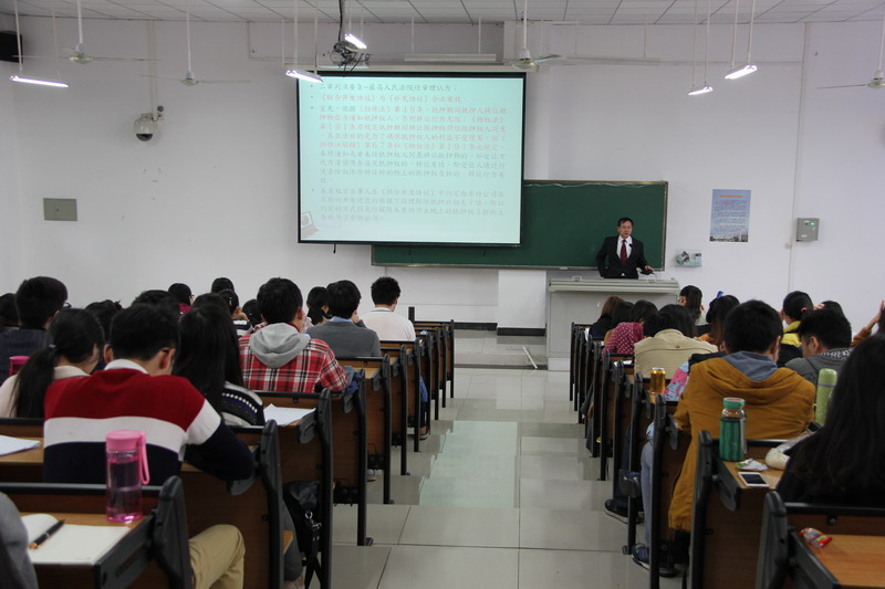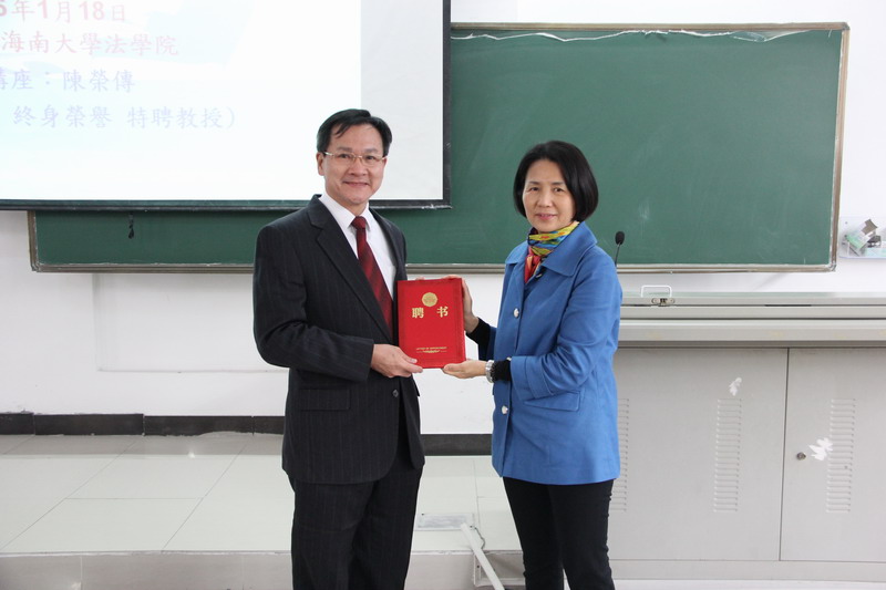 1月18日上午,台北大学终身荣誉特聘教授陈荣传应邀做客法学院冬季小学期,在5号教学楼311教室为法学院2013级本科生讲授了比较法专题课程。授课开始前,常务副院长叶英萍教授为陈荣传教授颁发了2015-2016学年冬季小学期授课外聘专家证书。邓和军副院长主持聘书颁发仪式。 课堂上,陈荣传教授首先以真实案例为引,对《中华人民共和国担保法》和《中华人民共和国物权法》的相关条文进行深入讲解。随后,陈荣传教授通过解读法条的方法对台湾地区《物权法》的相应条文进行了仔细分析。最后,陈荣传教授将两岸的物权法进行了比较和研究。陈荣传教授授课方式独特、新颖,讲课内容丰富,语言诙谐,并与同学们进行了良好的互动,课堂气氛活跃,激起了同学们对比较法的学习兴趣。