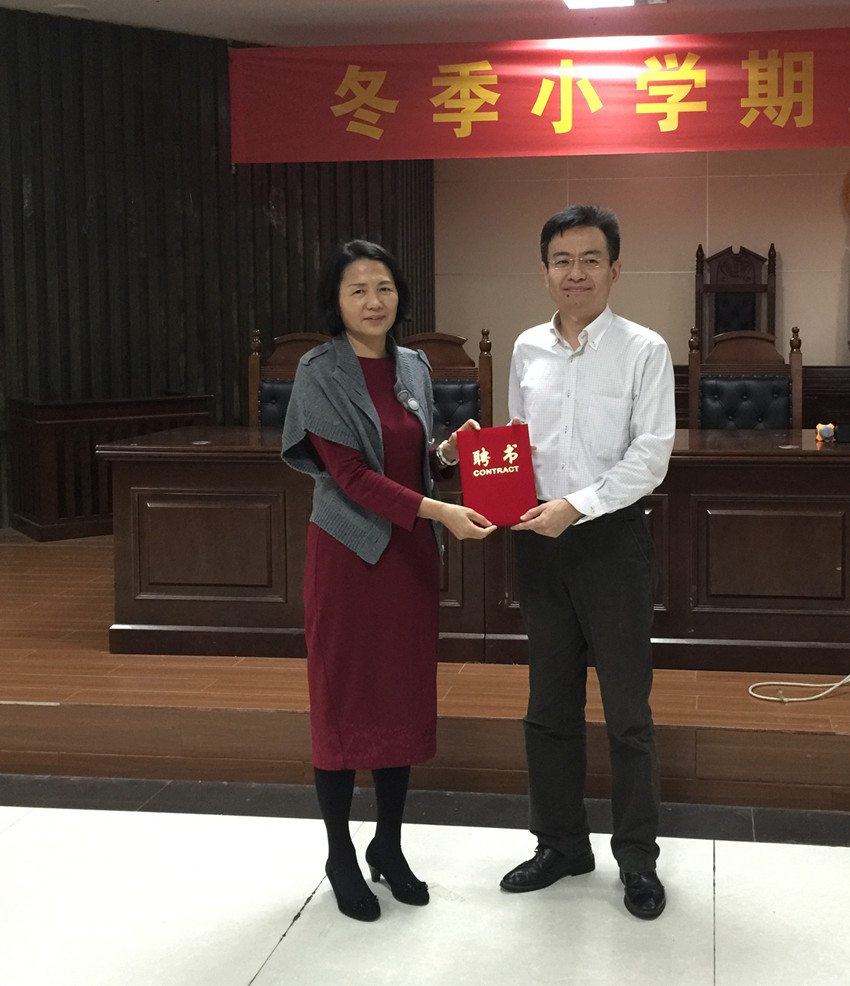 1月9日上午,中国政法大学的刘飞教授应邀做客法学院为2014级本科生授课。授课开始前由法学院常务副院长叶英萍教授为其颁发了冬季小学期授课聘书。
