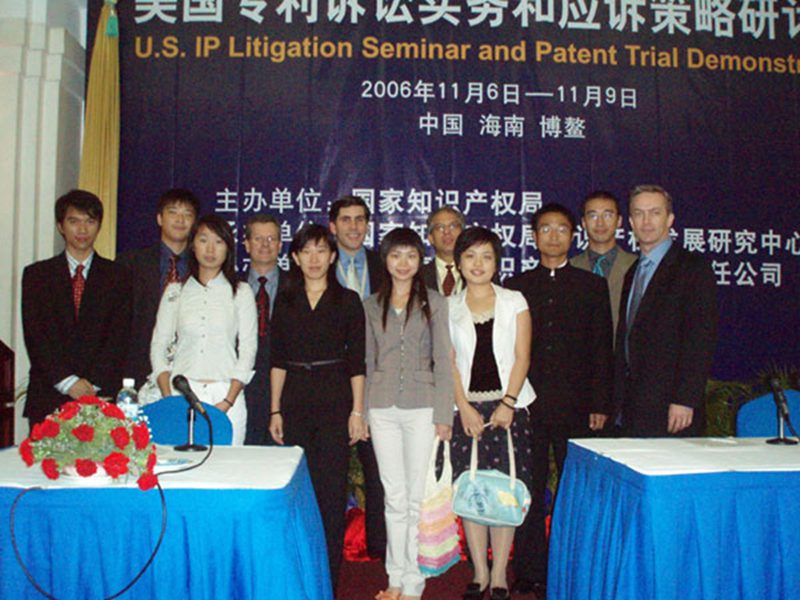 由国家知识产权局主办,国家知识产权局知识产权发展研究中心和北京康信知识产权代理有限公司承办的“美国专利诉讼实务及应诉策略研讨会”于2006年11月6日至9日在海南博鳌金海岸大酒店博鳌会议厅顺利召开。此次研讨会邀请美国联邦巡回法院加利福尼亚州北部地区法院的资深地方法官ELIZABETH D. LAPORTE和美国知名律师事务所Sughrue Mion PLLC进行了一场专利诉讼的模拟审判。 经面试选拔,我院选派王铭泽等八位同学赴博鳌为此次研讨会作志愿服务活动,并作为陪审团参与了模拟审判。他们在案件评议中的出色表现,受到了主办方和与会人员的一致好评。