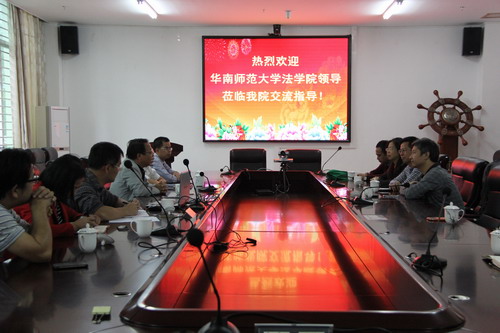 11月15日上午,华南师范大学法学院王涛院长、江乐忠书记一行五人到法学院开展工作交流活动。副校长、院长王崇敏、副院长叶英萍、院党委副书记杨智平和有关办公室负责人参加了交流会。