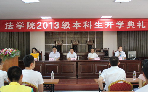9月13日上午,法学院2013级本科生开学典礼在法学院一楼报告厅隆重举行,法学院院长王崇敏、副院长王琦、宁清同、叶英萍、党委副书记杨智平以及部分教师代表、校友代表、全体辅导员、2013级119名新同学参加了开学典礼。典礼由杨智平副书记主持。