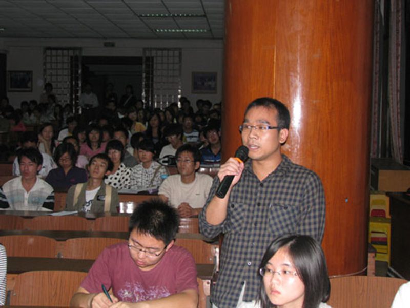 2009年12月10日晚,繁星满空,凉风习习,这注定是一个美妙绝伦的夜晚……应法学院邀请,中国古代散文学会副会长、海南省有突出贡献的优秀专家、海南师范大学文学院院长、硕士研究生导师——阮忠教授,在模拟法庭为法学师生讲授《古典诗词的情韵与艺术魅力》,王崇敏院长和200多名同学旁听了讲座,讲座由“两社”社长郑华琛同学主持。