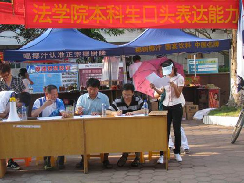 口头表达能力是法科学子必备的能力。为培养适应社会需要的优秀法科人才,挖掘潜力,提高我院学生综合素质,法学院团委、学生会在学院的统一部署下组织了本年度的口头表达能力测试,即街头演讲活动。 5月17日下午17:00,法学院2010年度口头表达能力测试在校二食堂门前正式开始。担任当天下午测试的评委为法学院张卫副教授、刘国良副教授、王祖志老师。每位同学手持喊话器进行演讲,限时五分钟,并由评委进行现场提问、评分、点评。由于演讲主题不限,所以“司法改革”、“海南房地产”、“国际旅游岛建设”、“我的家乡”等热点话题成为同学们演讲的主题。在演讲过程中,同学们精彩、卖力的演讲吸引了众多同学观看。 据悉,每年一度的口头表达能力测试是法学本科三年级学生的必修教学实践课程,并计入实践学分,本次街头演讲定于5月17日——5月30 号,每天下午17:00-19:00在二食堂门前进行。 街头演讲,锻炼的是胆量,展现的是风采,是一个鼓励同学们敢于秀出自己的大舞台。让我们共同期待法学院2010年度口头表达测试取得圆满成功! (文/图:院团学记者站 禤丽琴 杨勇超)