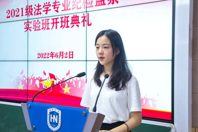 第四项,2021级实验班学生代表吴菁菁发言。吴菁菁同学首先回顾了自己加入实验班的历程,与大家一起交流了感想,并结合william威廉英国官网的校训“明法、修德、尚义、笃行”就如何成为一名合格的法律人提出了以下四点建议:第一,“明法”。在打基础阶段,同学们必须要通法理,知法史,晓法规,掌握最基础也是最重要的法学专业知识。第二,“修德”。吴菁菁同学指出,崇高的道德永远是一个法律人的追求。在接下来的学习生活中,同学们要始终不忘初心,永远怀着悲悯与善意,风光霁月地向前走去。第三,“尚义”。将来作为一名法律人,同学们要了解法律的公平正义,了解法律背后的价值理念,真正做到将自己所学奉献给社会。第四,“笃行”。法学院的学子不仅要学有所得,还要努力践履所学,做到知行合一。吴菁菁同学的精彩发言使每一位同学有深刻的感悟,相信同学们在接下来的法学路上一定谨记院训,砥砺前行。