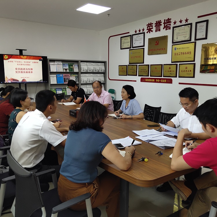 2019年10月24日中午,法学院在党员活动室召开“不忘初心、牢记使命”主题教育党支部工作会议推进会,院党委书记叶英萍、副书记李昌郁和各党支部书记参加,会议由叶英萍书记主持。