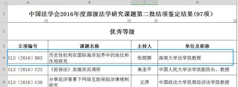 中国法学会2016年度部级法学研究课题第二批结项鉴定结果已公示,我中心研究员张丽娜教授中国法学会重点项目《历史性权利在国际海洋划界中的地位和作用研究》顺利结项,结项成绩优秀。